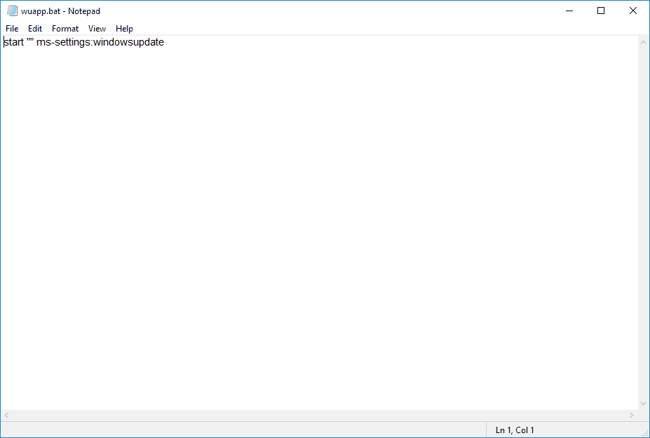 - And copy this batch file content: start “” ms-settings:windowsupdate.