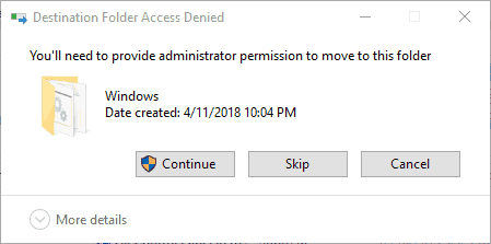 - As you drop the file into the Windows folder, a Destination Folder Access Denied dialog box opens > click Continue to drop the bat file into the directory.