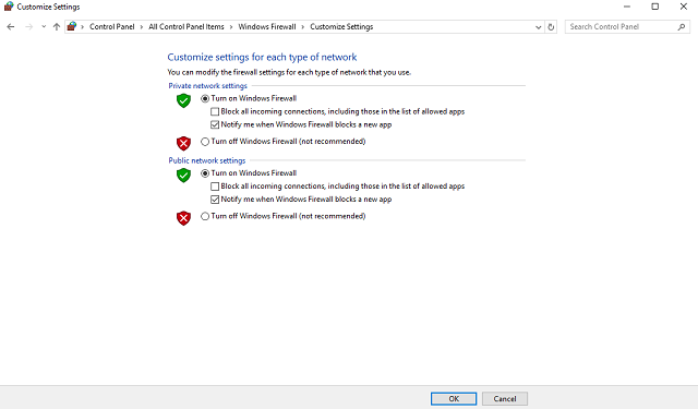 - Next, disable Windows Firewall for both private and public networks.