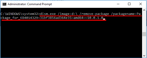 dism.exe /image:d:\ /remove-package /packagename: Package_for_KB4014329~31bf3856ad364e35~amd64~~10.0.1.0