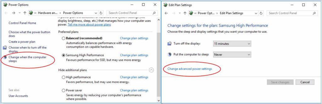 - Then click Change when the computer sleeps >Change advanced power settings.